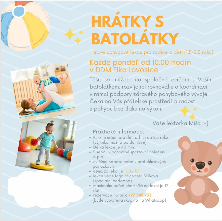 Těšit se můžete na společné cvičení s Vaším batolátkem, rozvíjející rovnováhu a koordinaci v rámci podpory zdravého pohybového vývoje. Čeká na Vás přátelské prostředí a radost z pohybu bez tlaku na výkon. Vaše lektorka Míša :-) HRÁTKY S BATOLÁTKY Hravé pohybové lekce pro rodiče a děti (1,5-2,5 roku) Každé pondělí od 10.00 hodin v DDM Elko Lovosice Praktické informace: Kurz je určen pro děti od 1,5 do 2,5 roku (výjimka možná po domluvě) Délka lekce je 40 min. S sebou - pohodlné sportovní oblečení a pití cvičíme naboso nebo v protiskluzových ponožkách cena za lekci je 100,- kč lekce vede Mgr. Michaela Sršňová (speciální pedagog) maximální počet účastníků na lekci je 12 dětí rezervace na tel.č.777 345 733 (bude vytvořena skupina na Whatsapp
